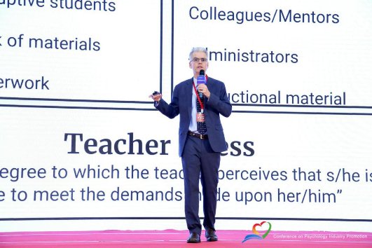 Christopher J. McCarthy教授就“如何运用‘创伤知情’团体干预技术有效预防教师压力?”发表主题报告。他介绍了对教师压力的调查,提出了理论模型来说明为什么教师容易受到压力。研究表明,通过将需求与资源相比较来评估压力的风险与工作满意度降低、倦怠症状水平增加以及教师职业承诺降低有着可靠的联系。而老师的资源和要求中一个很重要的议题是学生们经历的创伤,这给教师带来很大的压力。所以我们就要用团体的方式来帮助教师去理解创伤,学习如何去辨识哪些孩子们经历过创伤,用一种更有帮助性的方式来解决孩子们的这些问题,同时也可以帮助教师缓解自身的压力。